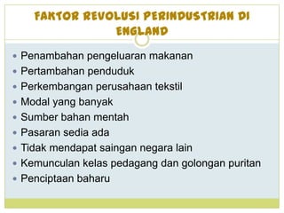 The Revolusi Perindustrian o Revolusi Perindustrian Pertama adalah proses perindustrian yang bermula di Great Britain pada separuh kedua abad ke-18 dan kemudian merebak ke seluruh Eropah dan Amerika Syarikat. 1 Dalam bidang Ekonomi. Zaman Neolithikum merupakan sebuah revolusi dalam.